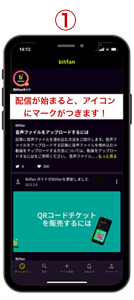 ①配信が始まると、アプリ内のアイコンにマークがつきますので、そのアイコンをタップします。