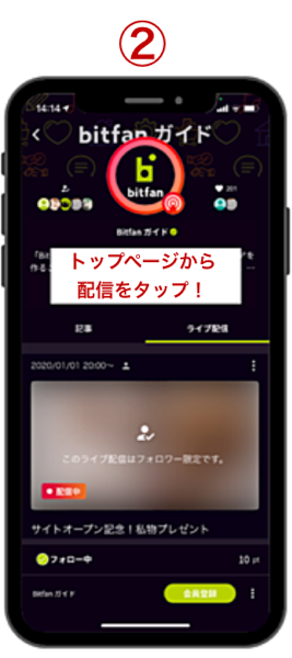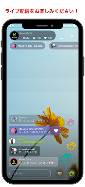 Bitfanアプリでのライブ配信の視聴方法については、下記をご参考にください。